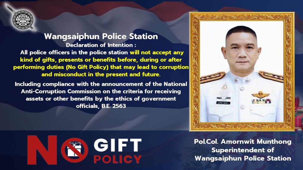 - ประกาศสำนักงานยุทธศาสตร์ตำรวจเรื่องเจตนารมณ์ที่จะไม่รับของขวัญหรือของกำนัลทุกชนิดจากการปฏิบัติหน้าที่