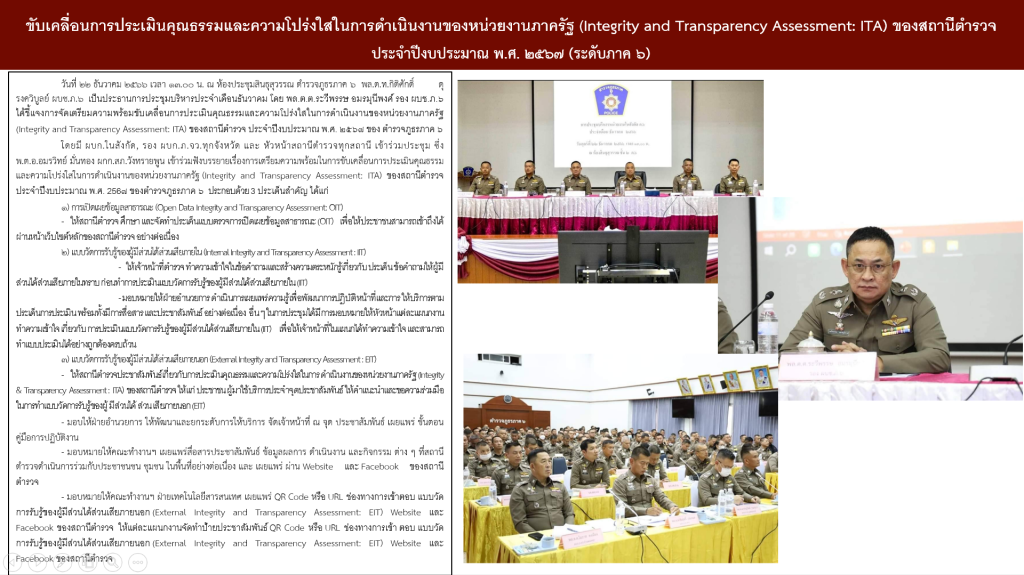 วันที่ ๒๒ ธันวาคม ๒๕66 เวลา 1๓.00 น. ณ ห้องประชุมสินธุสุวรรณ ตำรวจภูธรภาค ๖  พล.ต.ท.กิติศักดิ์        ดุรงควิบูลย์ ผบช.ภ.6  เป็นประธานการประชุมบริหารประจำเดือนธันวาคม โดย พล.ต.ต.ระวีพรรษ อมรมุนีพงศ์ รอง ผบช.ภ.๖ ได้ชี้แจงการจัดเตรียมความพร้อมขับเคลื่อนการประเมินคุณธรรมและความโปร่งใสในการดำเนินงานของหน่วยงานภาครัฐ (Integrity and Transparency Assessment: ITA) ของสถานีตำรวจ ประจำปีงบประมาณ พ.ศ. ๒๕๖๗ ของ ตำรวจภูธรภาค ๖
